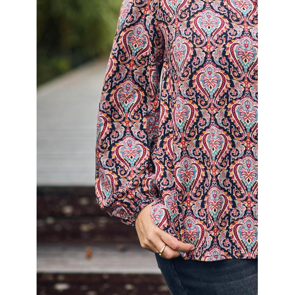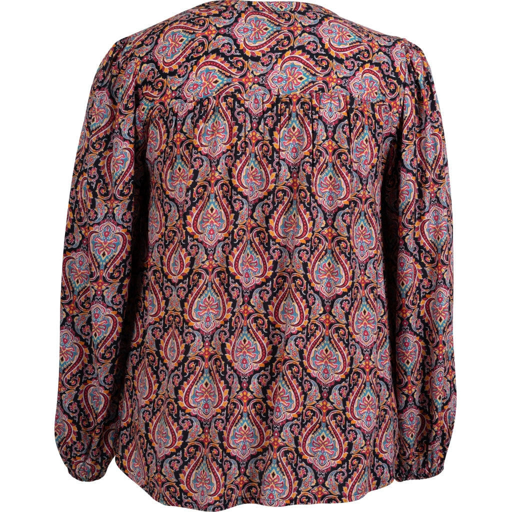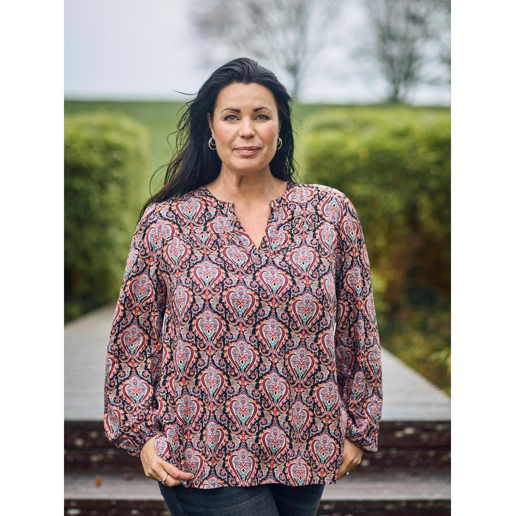 Denne smukke viskose bluse er designet i et moderne og feminint print på et let materiale, der falder smukt og giver en behagelig pasform. Den flatterende V-hals med liggende krave og de lange ærmer med elastik manchet understreger det stilfulde udtryk, mens den løse silhuet gør den nem at kombinere med både jeans, bukser og nederdele.