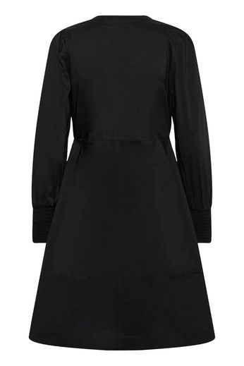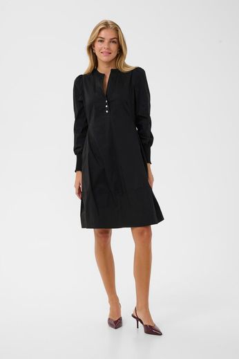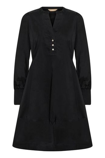 Denne midikjole har en løs pasform, V-udskæring med knapper og lange ærmer med rynkede manchetter. En A-formet silhuet sikrer komfort og alsidighed til enhver garderobe.