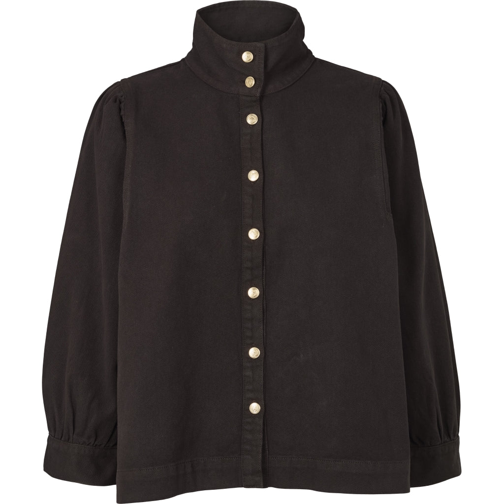 Figga Blouse er en skøn denim skjorten, som også kan bruges som en let jakke. Skjorten er enkel i snittet med en fin detalje i form at det påsyet ærme med et lille puf ved skulderen. Skjorten har en høj hals, 3/4 lange ærmer og er gennemknappet med otte knapper.