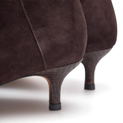 Saga. En feminin ankelstøvle fremstillet af 100 % LWG-certificeret ruskind med ASC-certificerede fiskelæderdetaljer og praktisk lynlås. Denne model er designet med en moderne hæl og en raffineret silhuet som er udstyret med WODEN's Natural Soft Technology™ for ekstra komfort, hvilket gør den alsidig til både dag- og aftenbrug.