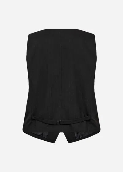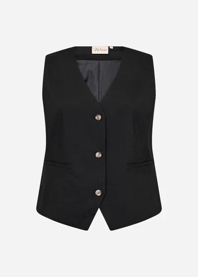 WA-SINDI 1 er en vest fremstillet af 65 % polyester, 33 % viskose og 2 % elastan. Den har et elegant design med V-hals, fire knapper foran, diskrete nålestriber og lommer foran. Sæt den sammen med matchende bukser for et elegant formelt look eller med jeans for et stilfuldt afslappet outfit.