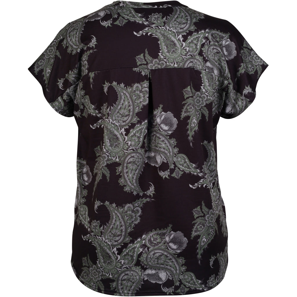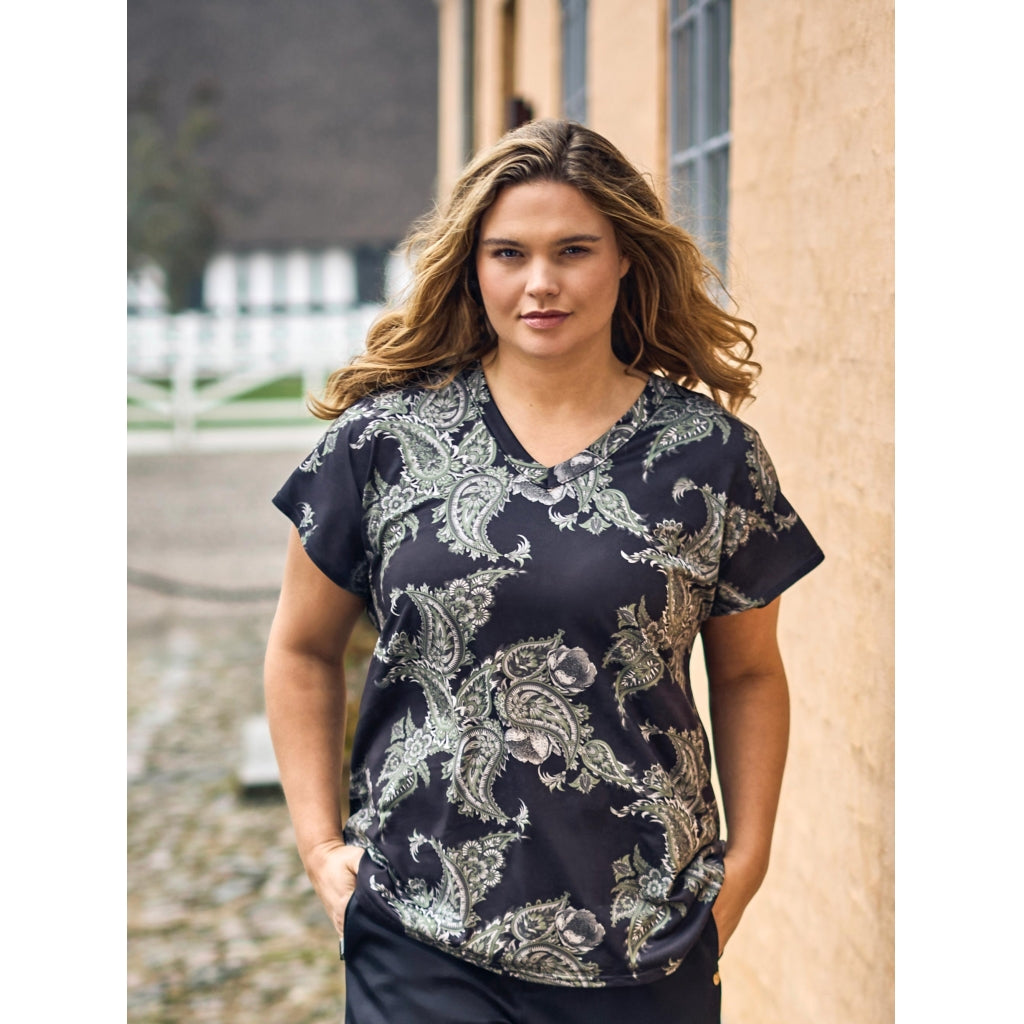 Denne dejlige T-shirt har en flatterende V-udskæring og afslappede, nedfaldende skuldre, der fungerer som ærmer. En ægte ZOEY-klassiker, der giver en rummelig og behagelig pasform gennem kroppen. Fremstillet i blødt viscosejersey og prydet med et iøjnefaldende grønt paisleymønster på sort baggrund. En søm bagpå med et subtilt læg tilføjer et stilfuldt detaljer.