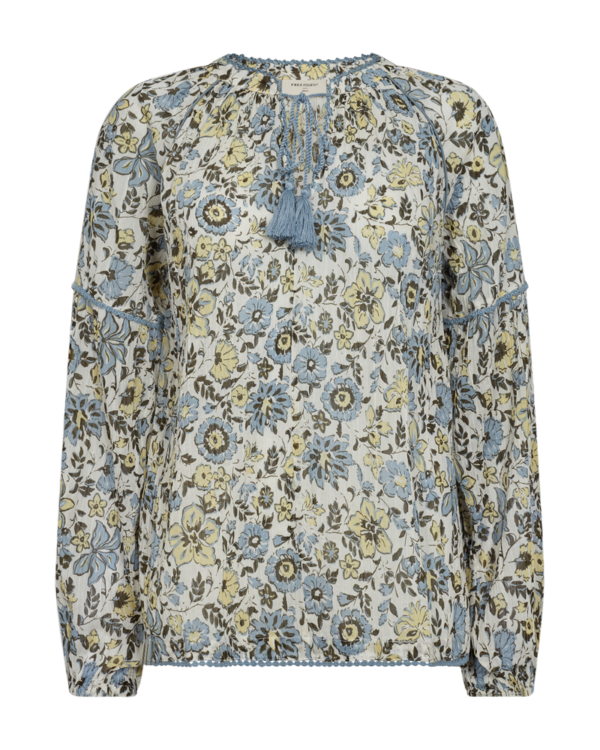 Bluse fra Freequent i en fin bomuldscrepe med et blomstret print. Blusen har lange ballonærmer, V-udskæring med en hæklet kant og bindebånd med kvaster, fine blondekanter samt piping-detaljer ved skuldrene.