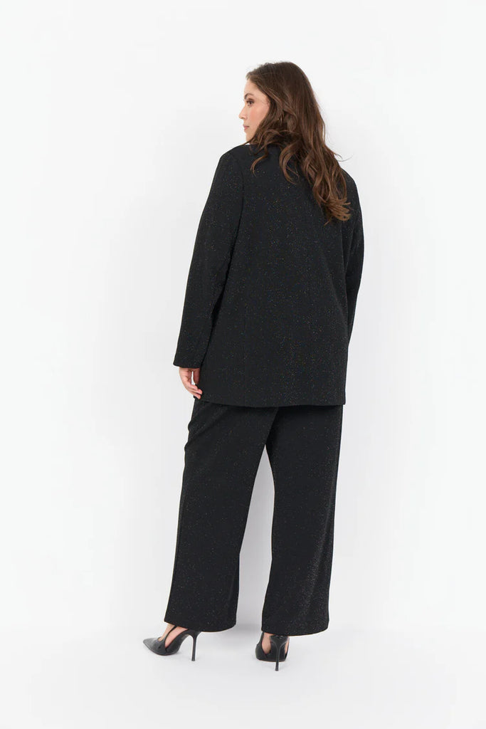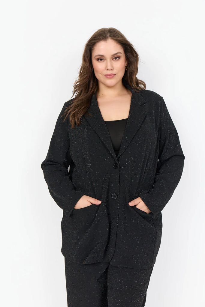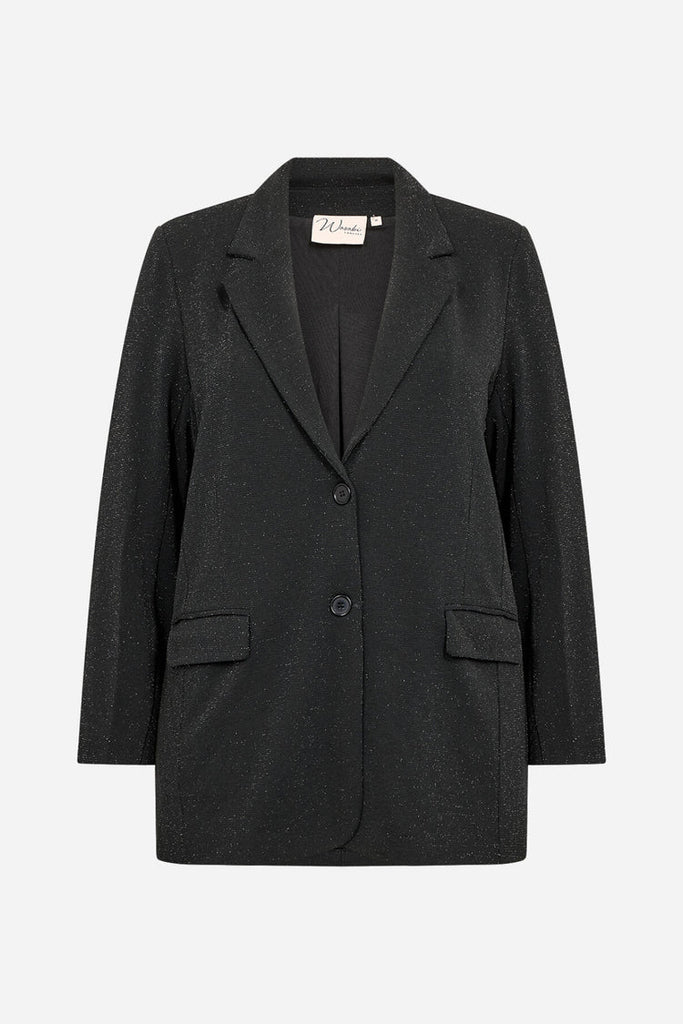 WA-SANJA 4 er en blazer, fremstillet af 50 % LENZING™ ECOVERO™-viskose, 42 % genbrugspolyester, 5 % metal, 3 % elastan. Denne elegante blazer har en klassisk reverskrave, lukning med to knapper, to klaplommer og en diskret skinnende tekstur. Sæt den sammen med skræddersyede bukser for et skarpt look eller med jeans for en mere afslappet stemning.