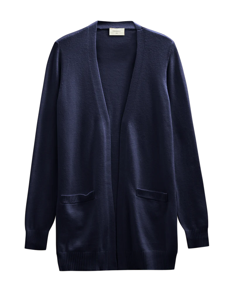Blød og behagelig cardigan i en klassisk mørkeblå nuance. Cardiganen har et åbent design uden lukning, lange ærmer og praktiske lommer foran. Ribkanter ved ærmer og bund giver et flot og afslappet udtryk, som gør den perfekt til både hverdag og arbejde.