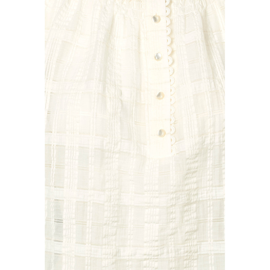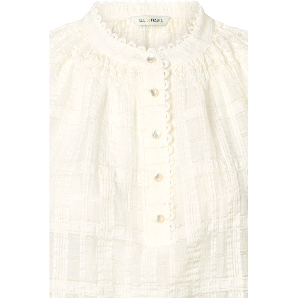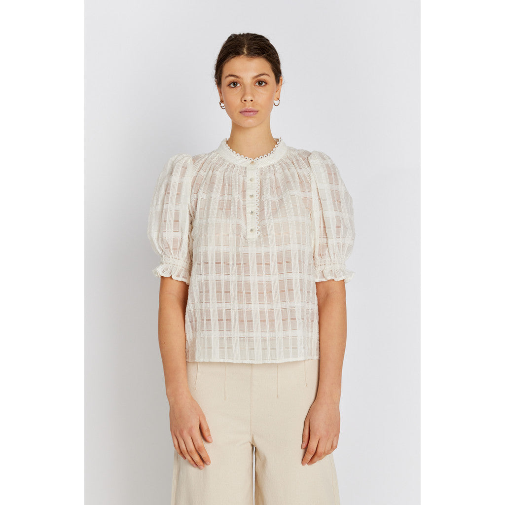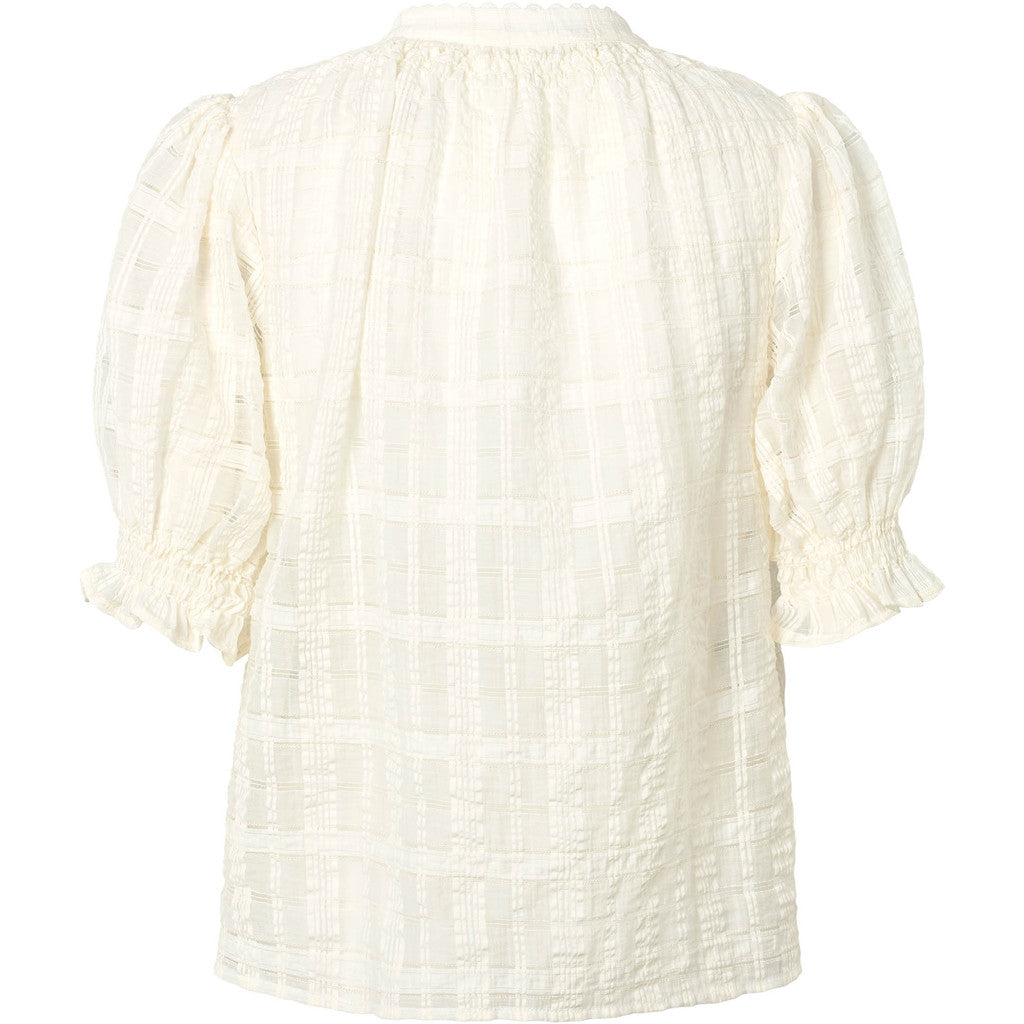 Rowan skjorte er en feminin skjorte med korte pufærmer og delikate detaljer. Den strukturerede overflade og lille ståkrave giver et let og elegant udtryk med et strejf af vintage.