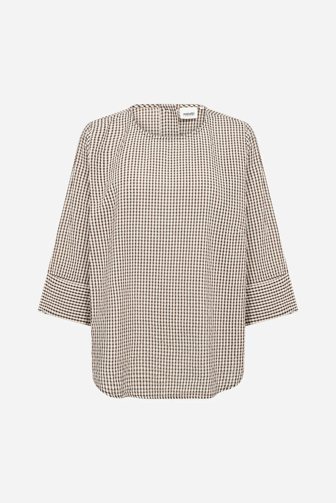WA-SAINA 2 er en dejlig bluse fremstillet af 100 % økologisk bomuld. Denne elegante bluse har rund hals, udsatte ærmer og et tidløst ternet print. Sæt den sammen med skræddersyede bukser eller jeans for et stilfuldt look.